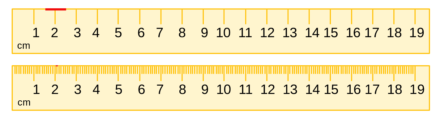 ধরা যাক আমাদের কাছে নিচের ছবির মত দুটো স্কেল আছে। প্রথম স্কেলে শুধু cm-এ দাগ কাটা, দ্বিতীয় স্কেলে cm-কে দশ ভাগ করা, অর্থাৎ mm পর্যন্ত দাগ কাটা।