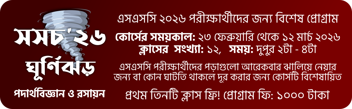 ২১ এপ্রিল ২০২৬ থেকে শুরু হচ্ছে এবছরের এসএসসি পরীক্ষা। সসচ'২৬ ঘূর্ণিঝড় প্রোগ্রামটি আগের পড়াগুলো আরেকবার ঝালিয়ে নেয়ার জন্য অথবা কোন অধ্যায়ে ঘাটতি থেকে গেলে তা পূরণের জন্য। যাদের কোন কারণে এখন পর্যন্ত সামগ্রিক প্রস্তুতি খুব ভালো হয়নি, তাদের জন্য এটা বিশেষভাবে উপযুক্ত। ইন শা আল্লাহ, আমাদের ক্লাসগুলো মনযোগের সাথে করলে ও নির্দেশনাগুলো মেনে চললে তুমি দ্রুত সময়ে পরিষ্কার কনসেপ্ট ও একইসাথে সুন্দর প্রস্তুতি অর্জন করতে পারবে।
